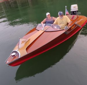 This boat was salvaged from a house fire late in the 20th century and acquired by AristoCraft boats. They stored it for a number of years and then restored it around 2014. In 2016 a new Tohatsu engine was fitted to the boat along with a classic Johnson cowling.